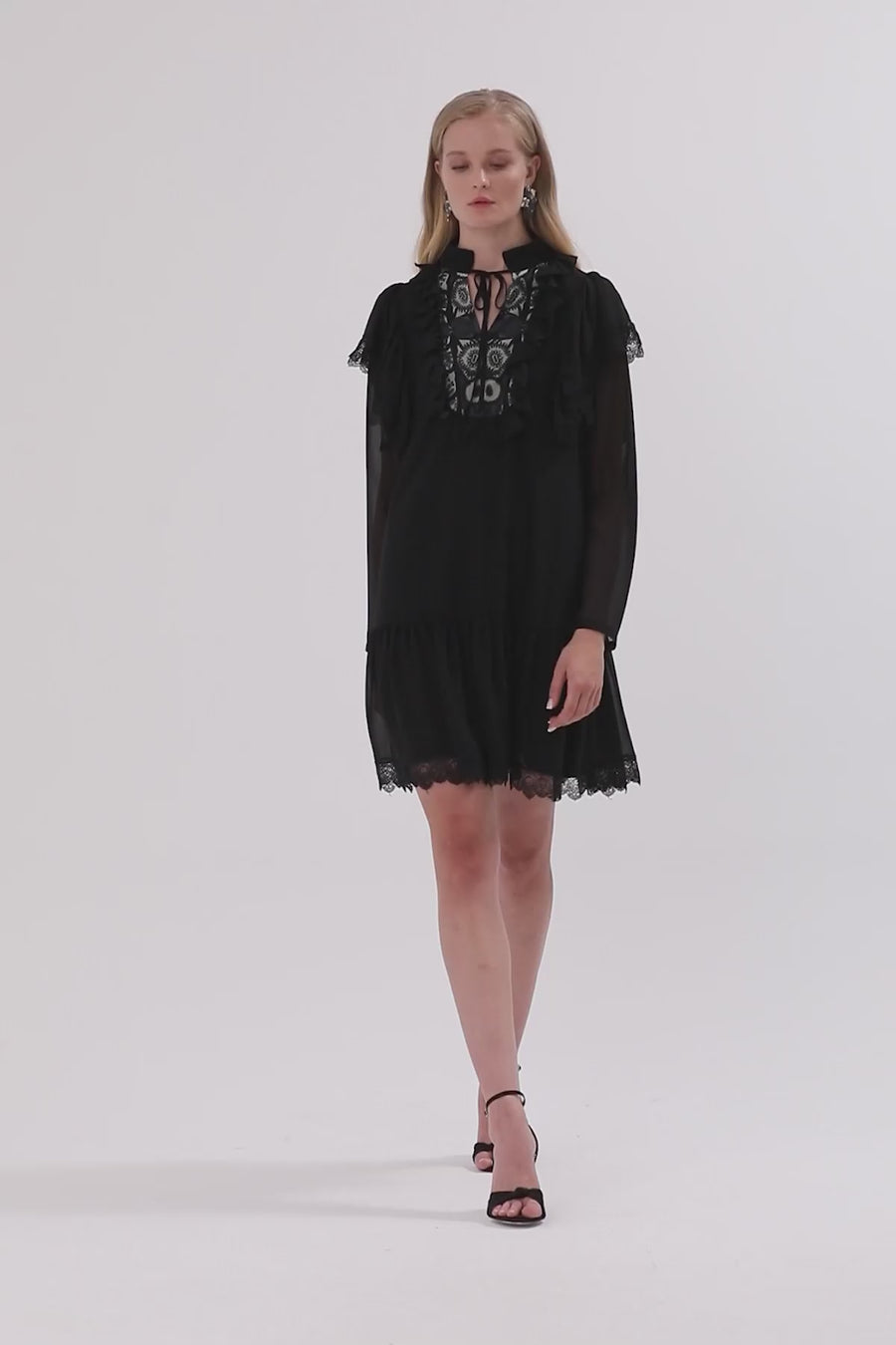 Black Embroidered-Collar Bow-Detail Maxi Dress