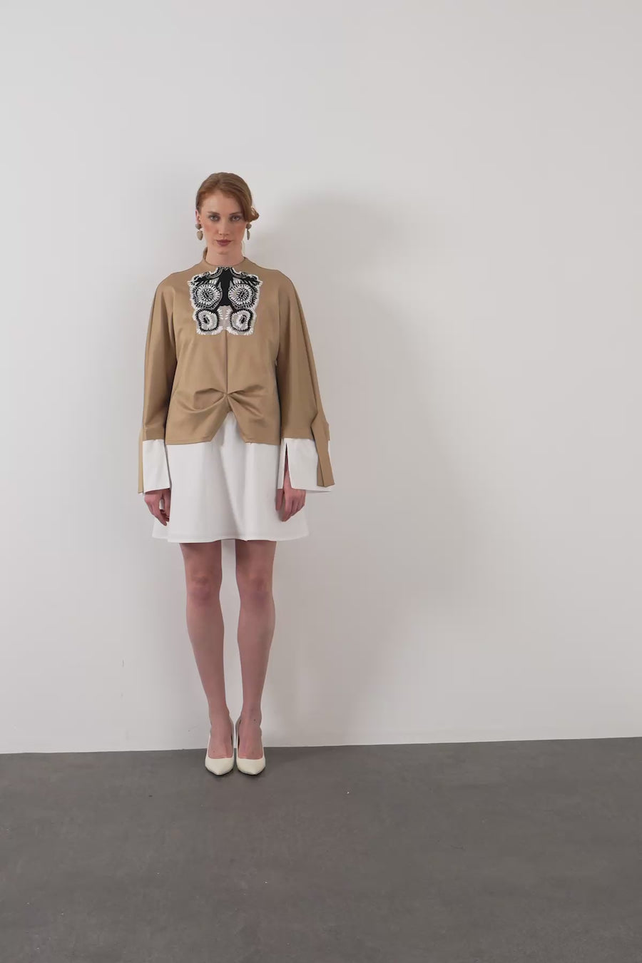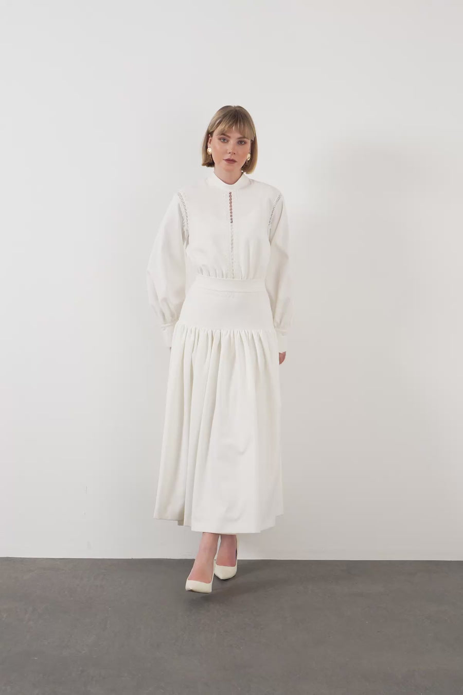 Ecru Embroidered-Sleeve Midi Dress