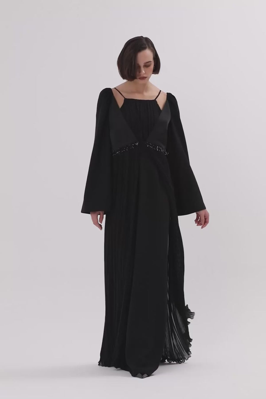 Black Beaded Pleated Long Dress