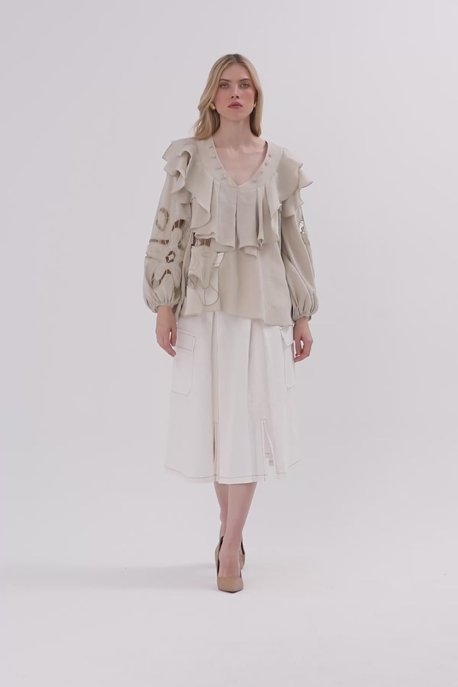 Beige Ruffle Embroidered Blouse
