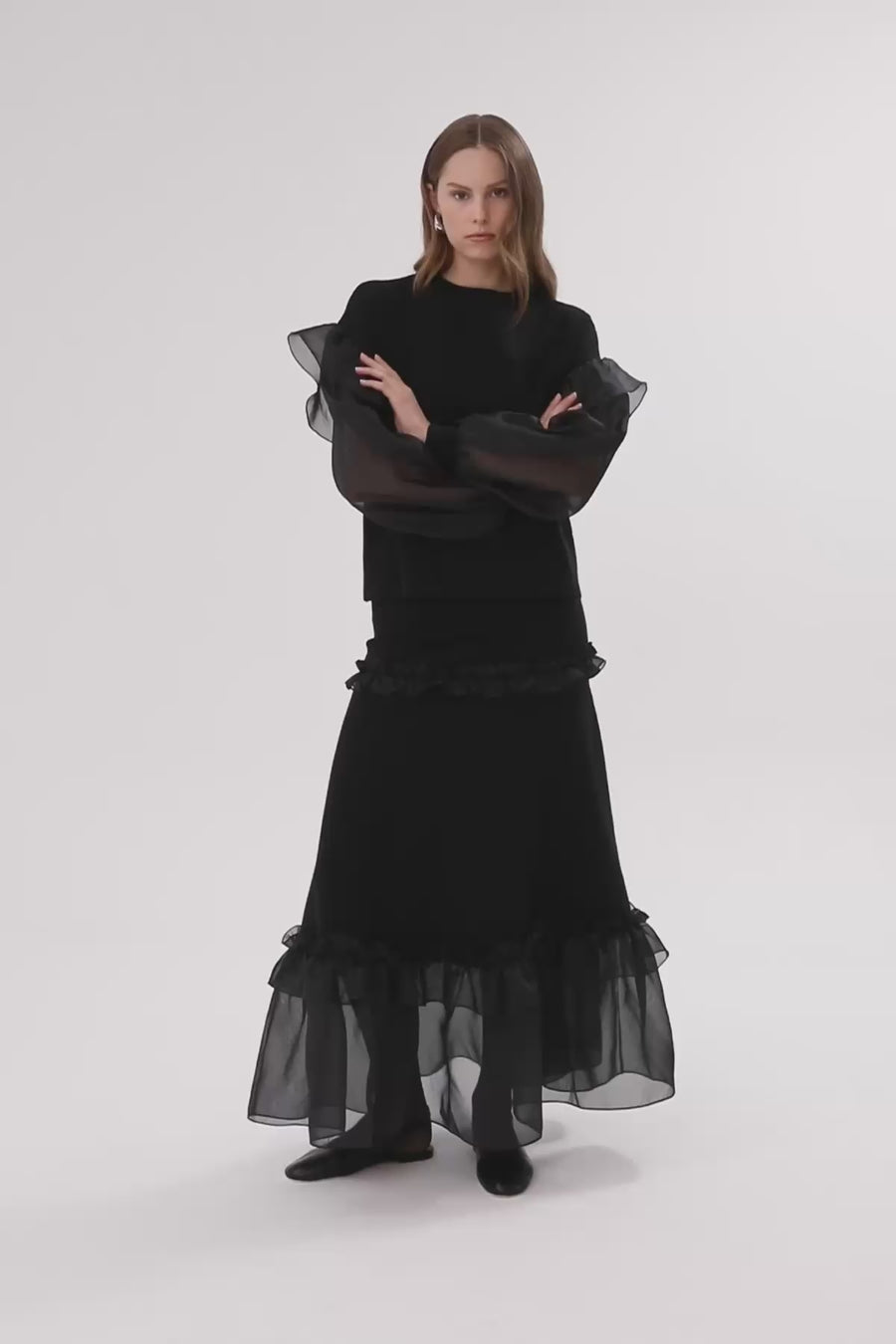 Black Tulle Ruffle Sleeve Blouse