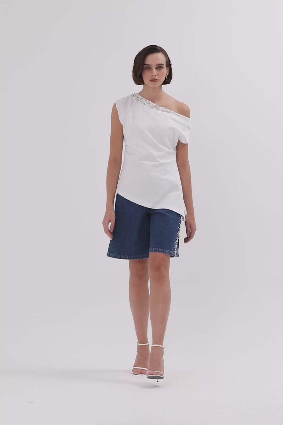 White One-Shoulder Crystal Trim Blouse