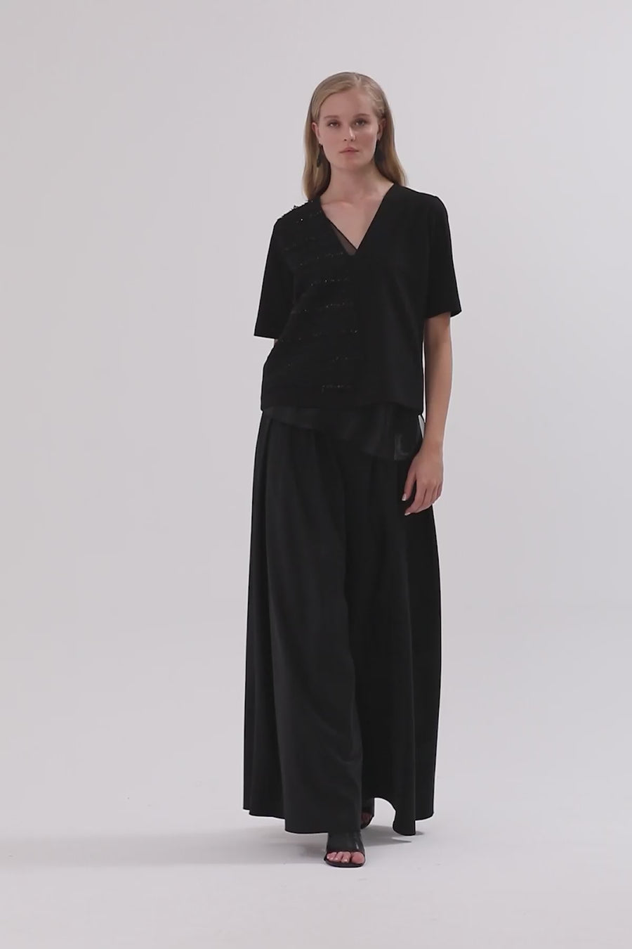 Black Organza Panel V-Neck Blouse