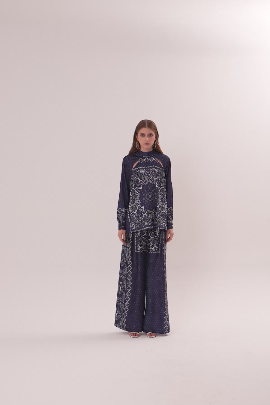 Navy Embroidered Chain-Stitch Long-Sleeve Blouse