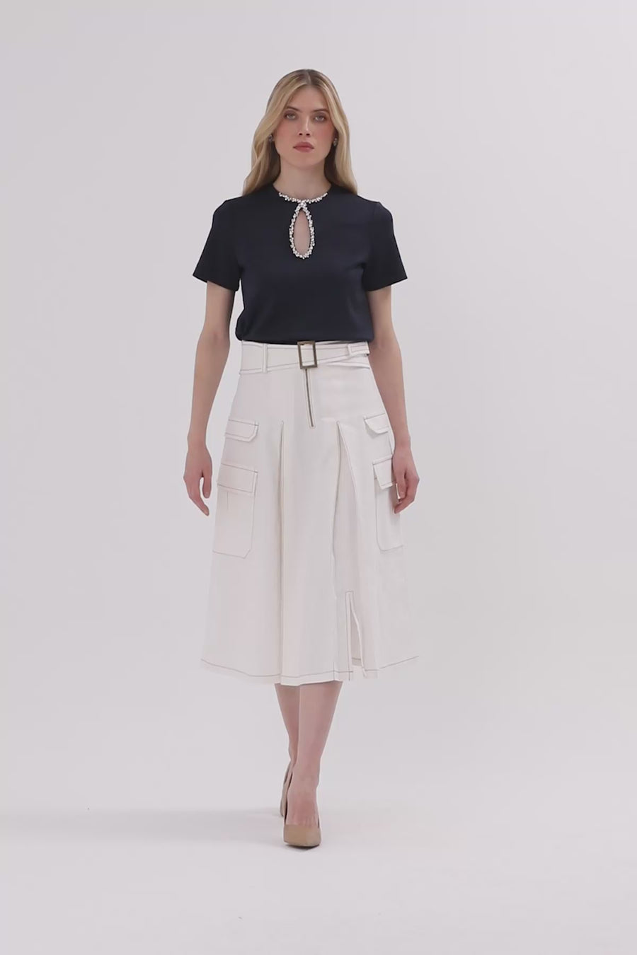 Ecru Belted Midi Skirt