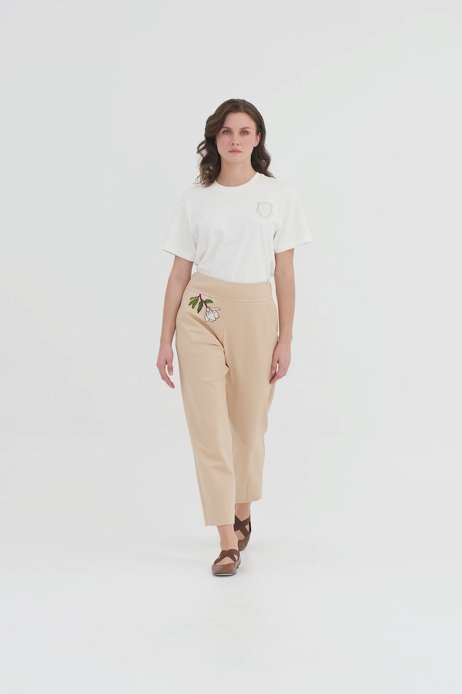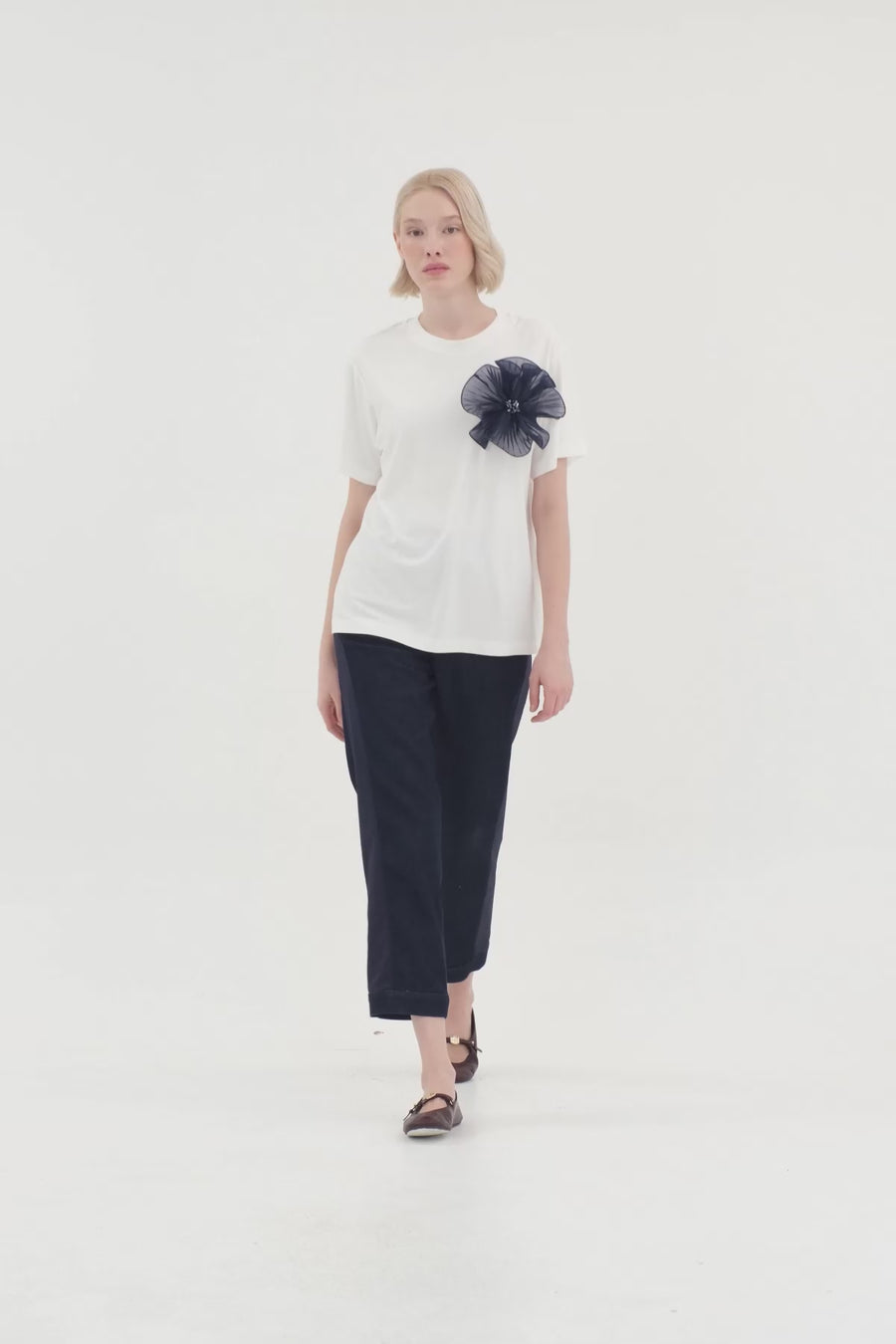 Ecru Pleated and Embroidered Floral Accent T-Shirt