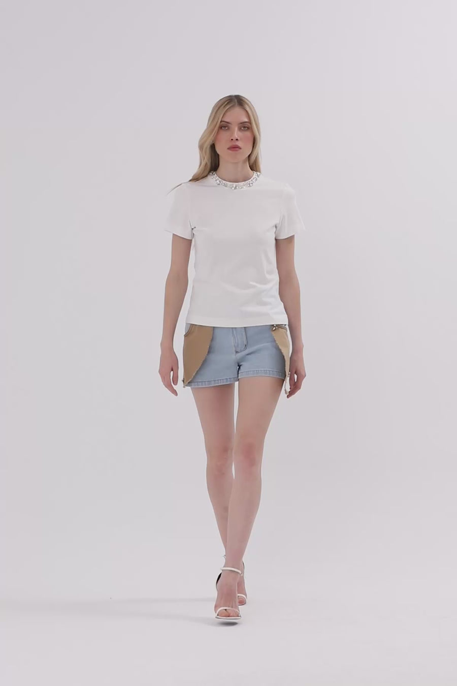 White T-Shirt with Stone-Embellished Collar