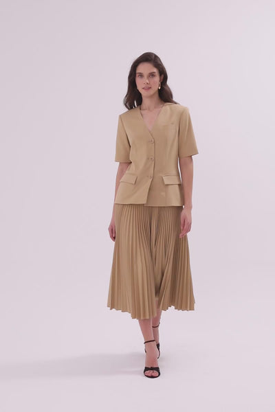 Beige Pleated Short-Sleeved Long Dress