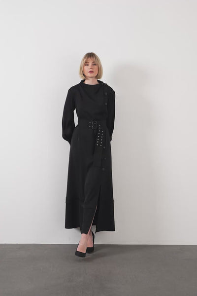 Black Sash-Detail Slit Midi Dress