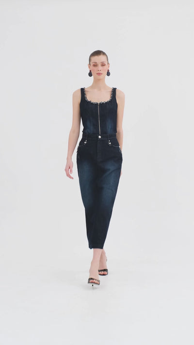 Blue Embroidered Denim Pencil Skirt