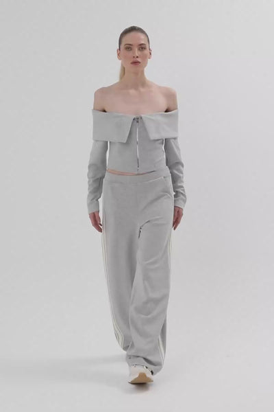Grey Boat Neck Striped Sleeve Blouse