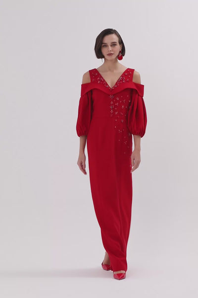 Red Long Dress with Balloon Sleeves