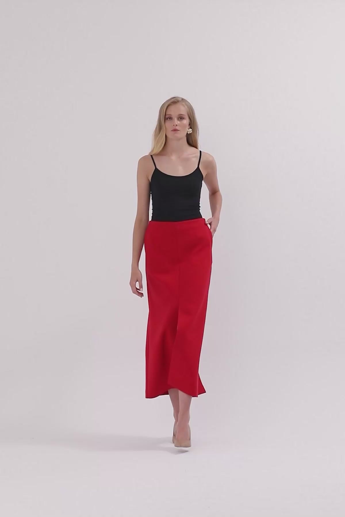 Red Pocketed Slit-Detail Midi Skirt