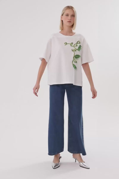 White Embroidery Detail Beaded Trim T-Shirt