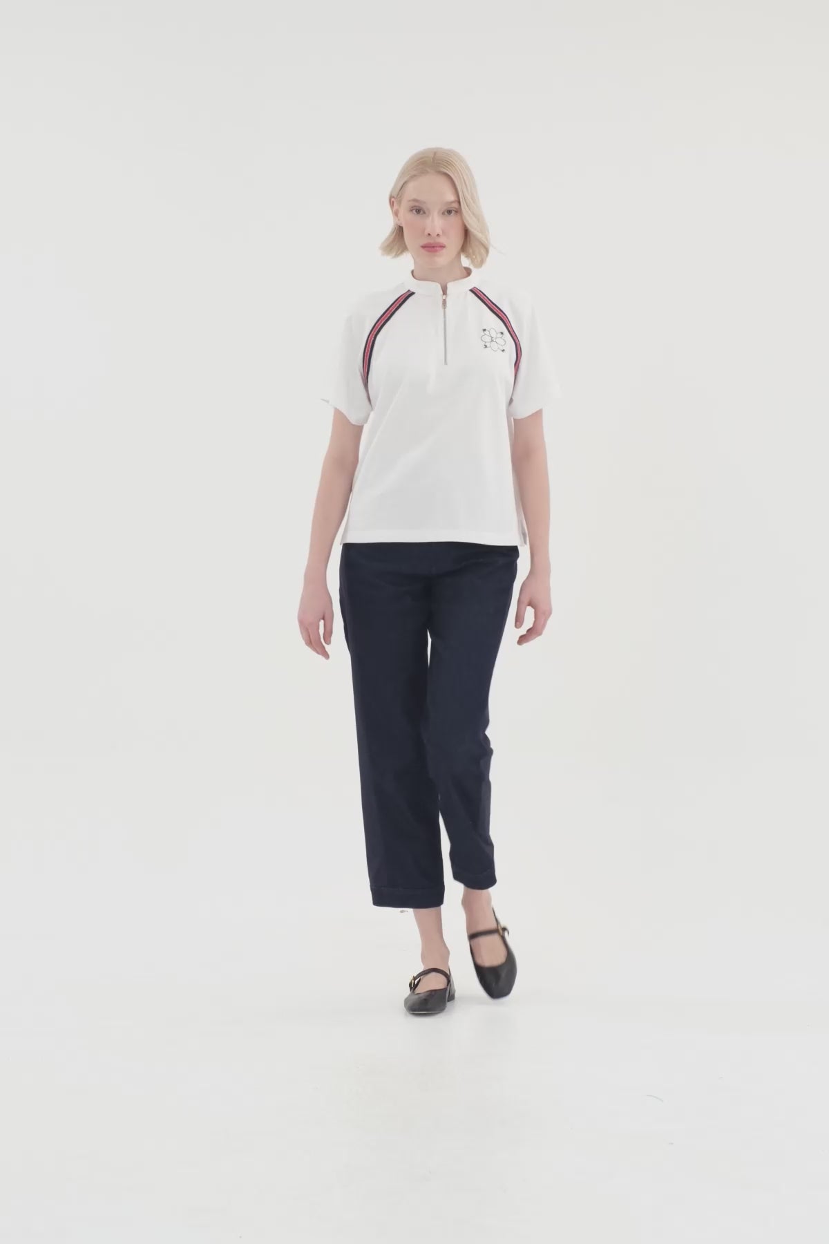 White Knit-Trim Embroidered Zip T-Shirt